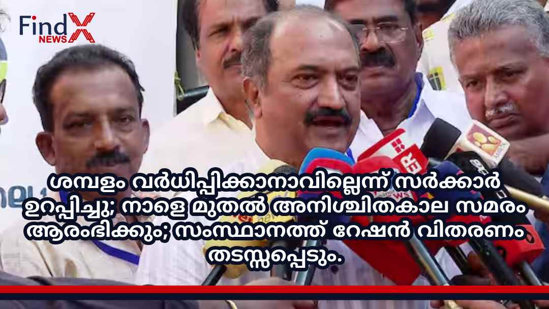 ശമ്പളം വർധിപ്പിക്കാനാവില്ലെന്ന് സർക്കാർ ഉറപ്പിച്ചു; നാളെ മുതൽ അനിശ്ചിതകാല സമരം ആരംഭിക്കും; സംസ്ഥാനത്ത് റേഷൻ വിതരണം തടസ്സപ്പെടും.